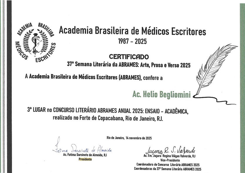 O Acadêmico Helio Begliomini, emérito da cadeira nº 21, que tem por patrono Benedicto Augusto de Freitas Montenegro (1888-1979), foi premiado com o terceiro lugar na categoria “ensaio”, no concurso literário anual da Abrames – Academia Brasileira de Médicos Escritores, sodalício em que é membro fundador da cadeira no 33, sob a patronímica de Edgard Roquette-Pinto (1884-1954).