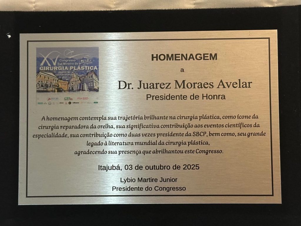 Na semana passada, o Acadêmico Juarez Moraes de Avelar foi homenageado no 15º Congresso Sul-Mineiro de Cirurgia Plástica, presidido pelo Acadêmico Lybio José Mártire Junior. O evento foi realizado nos dias 03 e 04 de outubro de 2025, em Itajubá/MG.