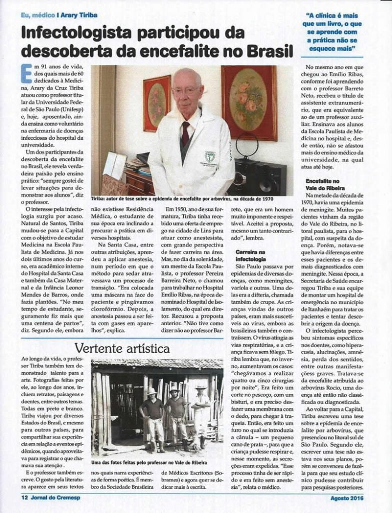 O Acadêmico Arary Da Cruz Tiriba Foi Homenageado Em Matéria Publicada No Jornal De Cremesp Nº 339, Agosto/2016. 30.09.2016 | Gerais